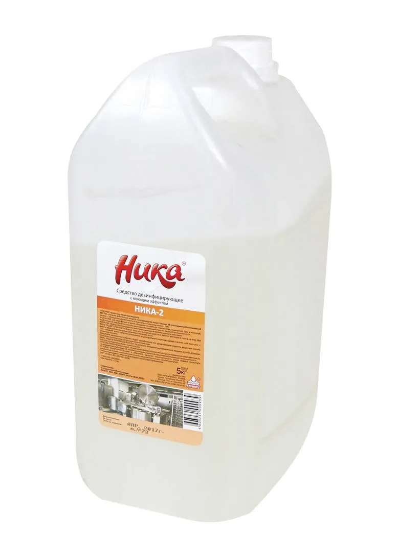 Дезинфицирующее средство «НИКА-2» 5 кг — концентрированное щёлочное моющее дезсредство на основе ЧАС для одновременной дезинфекции и мытья оборудования, тары, инвентаря и рабочих поверхностей на предприятиях пищевой промышленности и в профессиональной уборке.