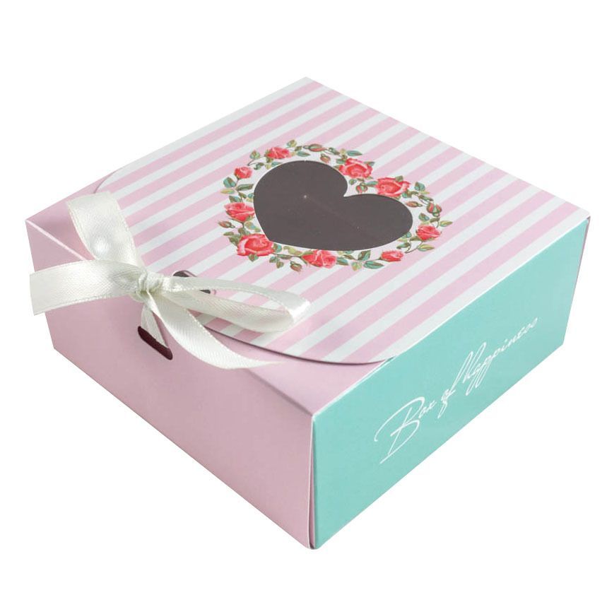 Коробка бумажная для конфет Розовые полоски с сердцем с окном и лентой. Используют для упаковки и транспортировки конфет при доставке.