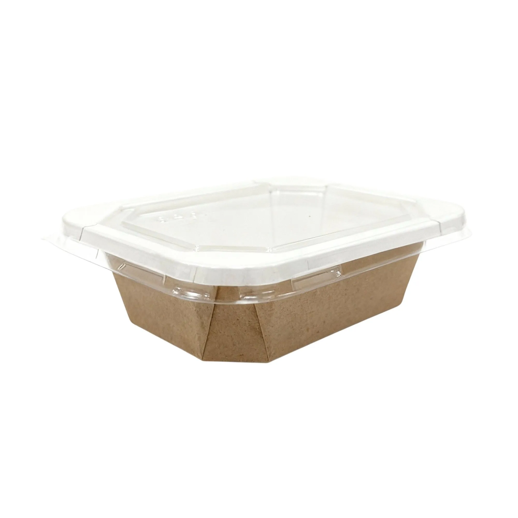 Запатентованная 8-угольная конструкция с широким сформованным бортиком обеспечивает повышенную жесткость без деформации — самый прочный среди картонных аналогов. Сформованная конструкция без клея не требует сборки, плоская RPET крышка закрывается одним движением с усиленными замками, исключая протекание. Выдерживает прожиривание, нагрев в СВЧ (+120°C), шоковую заморозку (-30°C), внутренняя влагостойкость и герметичность дна, подходит под запайку.