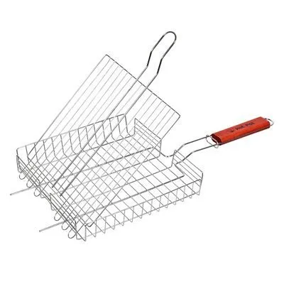Деревянная ручка не нагревается при использовании. Надежное кольцо-фиксатор гарантирует, что решетка не откроется и продукты не вывалятся на угли. Опоры позволяют устойчиво закрепить решетку на мангале.