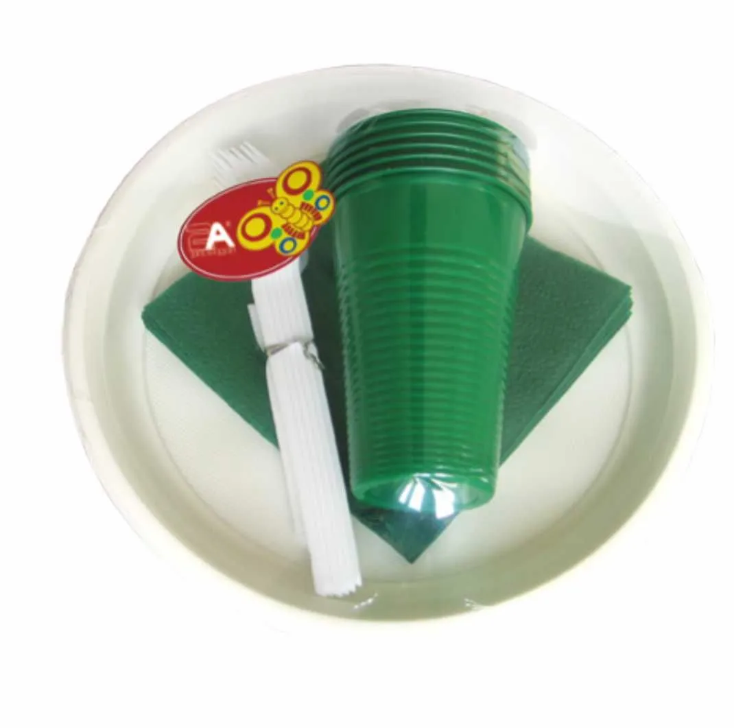 В набор пластиковой посуды входят: тарелки  6шт, одноразовые стаканы зеленые 6 шт, одноразовые вилки белые 6шт,  салфетки зеленые, зубочистки в индивидуальной упаковке 6 шт