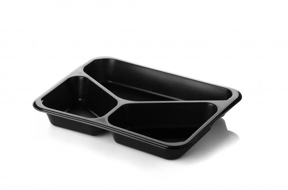 Трехсекционный лоток используется как под запайку, так и под крышку для фасовки мясных и рыбных полуфабрикатов, готовых блюд, салатов, деликатесов. Можно разогревать в СВЧ-печи.